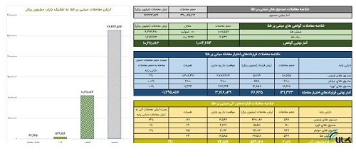 در معاملات روز گذشته بازار ابزارهای مبتنی بر طلای بورس کالای ایران در مجموع ۳۹۰ میلیون واحد صندوق های مبتنی بر طلا به ارزش حدود ۲.۶ همت معامله شد. روز گذشته معاملات صندوق طلای لوتوس با ۱۴ درصد بیشترین نسبت ارزش معاملات آتی به ارزش معاملات دارایی پایه را داشت.