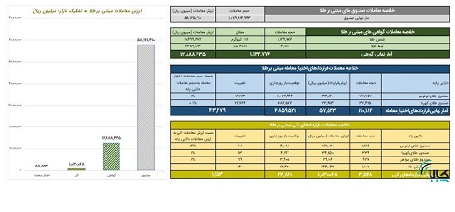 در قراردادهای اختیار معامله مبتنی بر طلا نیز ۱۱۰ هزار و ۱۸۲ قرارداد به ارزش ۵.۷ میلیارد تومان دادوستد شد. در قراردادهای اختیار معامله صندوق طلای لوتوس بیشترین نسبت حجم معاملات قراردادهای اختیار معامله به حجم معاملات دارایی پایه را به خود اختصاص داد.