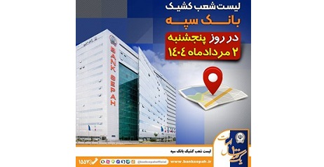 به منظور پاسخگویی به نیازهای ضروری مشتریان محترم در روز پنجشنبه، (دوم مردادماه) واحدهای پشتیبان ستادی و شعب کشیک بانک سپه از ساعت ۸ الی ۱۲ آماده ارائه خدمت به مشتریان خواهند بود.