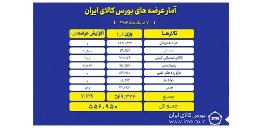 تالارهای بورس کالای ایران در روز سهشنبه ۷ مرداد ماه میزبان عرضه ۵۵۶ هزار و ۹۵۰ تن انواع محصول هستند که بیشترین حجم عرضه امروز در تالار حراج همزمان و متعلق به سیمان است.
