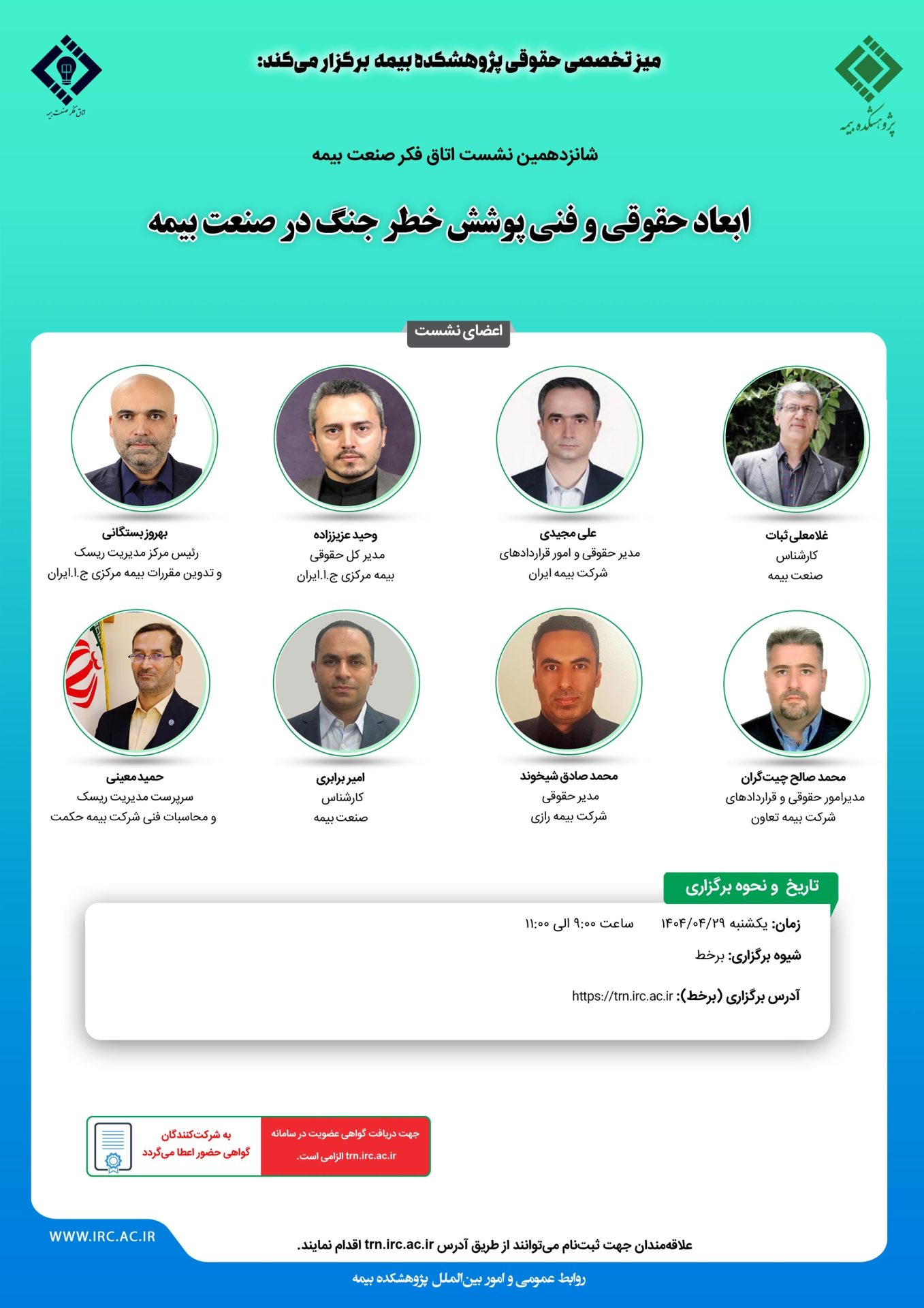 حضور در این نشست برای عموم آزاد و مستلزم ثبتنام از طریق سامانه مدیریت یادگیری پژوهشکده بیمه به نشانی https://trn.irc.ac.ir میباشد. پس از ثبتنام، ورود به نشست از طریق همین نشانی امکانپذیر خواهد بود و به کلیه شرکت کنندگان نیز گواهی حضور اعطا میگردد.