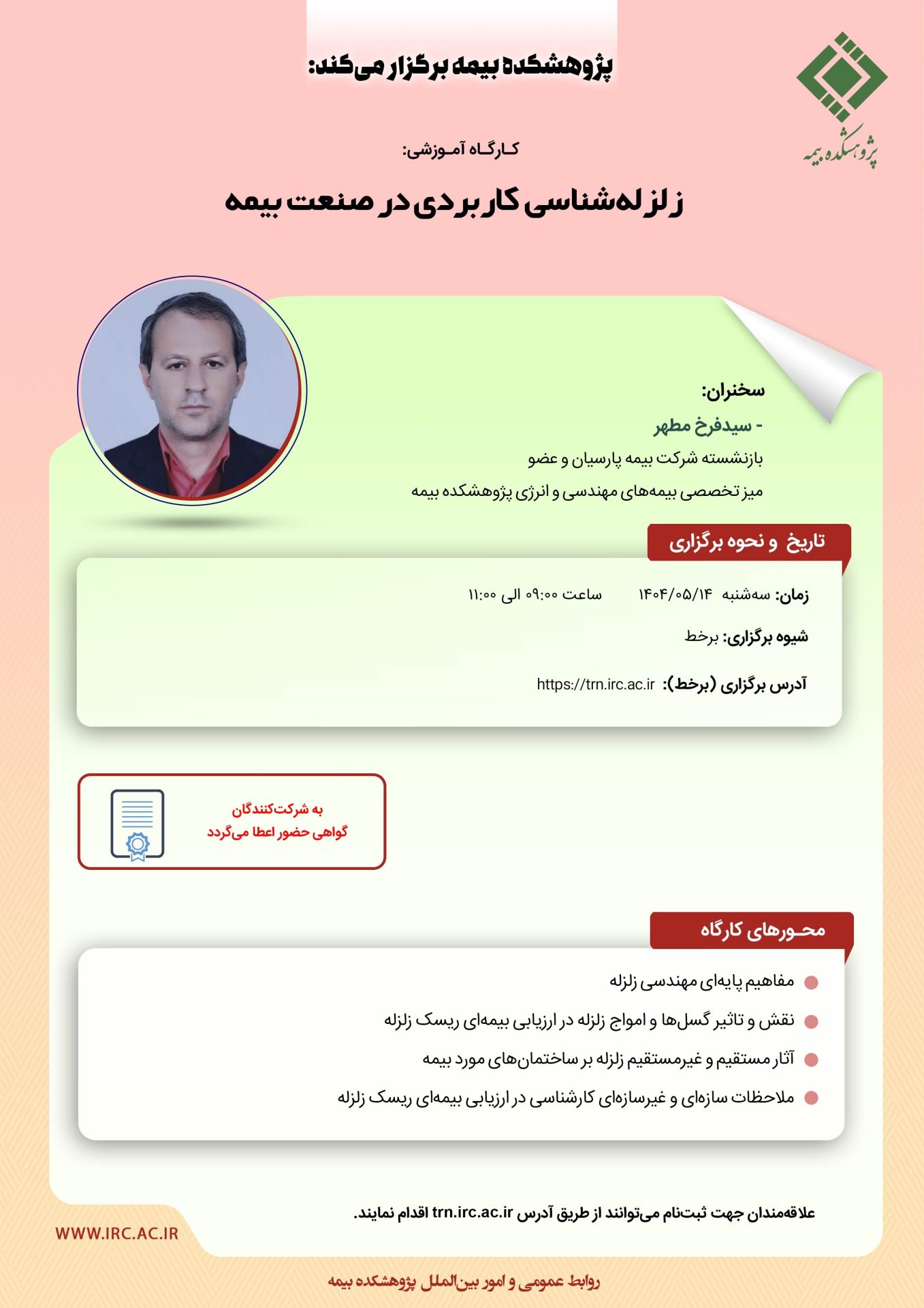 کارگاه آموزشی با عنوان: “زلزله شناسی کاربردی در صنعت بیمه” از ساعت ۹:۰۰ تا ۱۱:۰۰ روز سهشنبه ۱۴مرداد ۱۴۰۴ به صورت برخط از طریق سامانه مدیریت یادگیری پژوهشکده بیمه برگزار میشود.