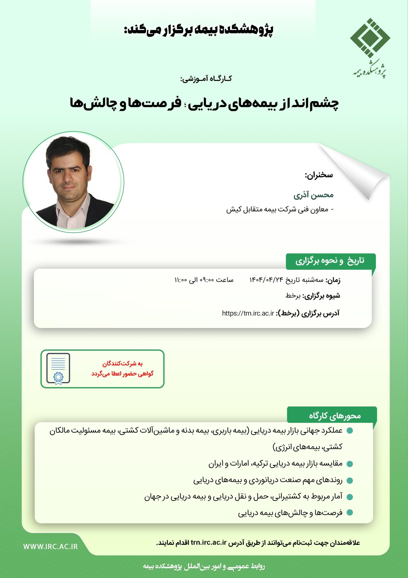 کارگاه آموزشی با عنوان: «چشم انداز بیمه های دریایی؛ فرصت ها و چالش ها» از ساعت ۹:۰۰ تا ۱۱:۰۰ روز سهشنبه ۲۴ تیر ۱۴۰۴ به صورت برخط از طریق سامانه مدیریت یادگیری پژوهشکده بیمه برگزار میشود.