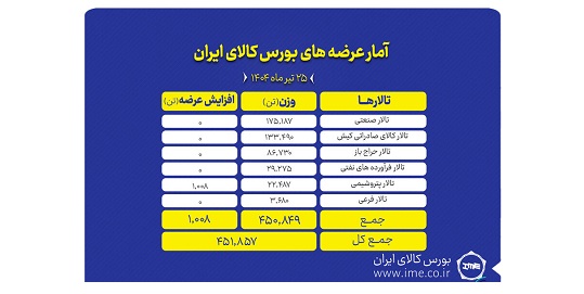 تالارهای بورس کالای ایران امروز چهارشنبه ۲۵ تیر ماه میزبان عرضه ۴۵۱ هزار و ۸۵۷ تن انواع محصول است. بیشترین عرضه امروز در تالار صنعتی رقم می خورد.