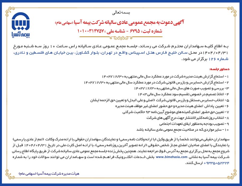 به گزارش فراسو، متن کامل آگهی دعوت به مجمع بیمه آسیا بدین شرح است: