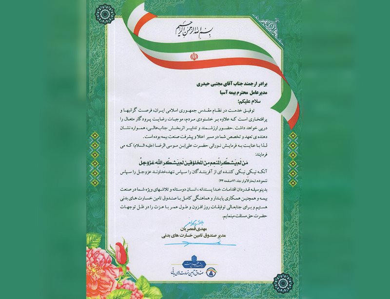 به گزارش فراسو به نقل از روابط عمومی بیمه آسیا، در قسمتی از لوح تقدیر ارسالی از سوی مهدی قمصریان، مدیر صندوق تأمین خسارت های بدنی خطاب به مدیرعامل بیمه آسیا آمده است: