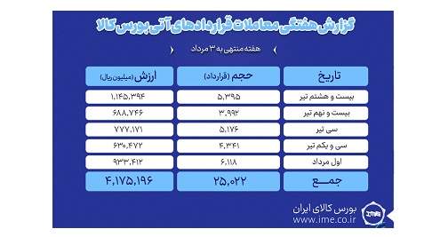 بررسی روند معاملات قراردادهای آتی بورس کالای ایران درهفته منتهی به ۳ مرداد نشان می دهد که در هفته گذشته ارزش معاملات بازار آتی به بیش از ۴۱۷ میلیارد تومان رسید.