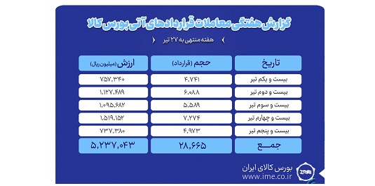 بررسی روند معاملات قراردادهای آتی بورس کالای ایران درهفته منتهی به ۲۷ تیرماه نشان می دهد که در هفته گذشته ارزش معاملات بازار آتی به بیش از ۵۲۳ میلیارد تومان رسید.