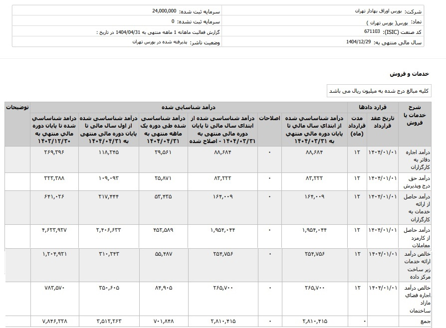 شرکت بورس تهران جزئیات و مجموع درآمدهای سال مالی منتهی به ۳۱ خرداد ۱۴۰۴ را منتشر کرد.