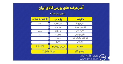 تالارهای بورس کالای ایران روز دوشنبه ۱۶ تیر ماه میزبان عرضه ۳ میلیون و ۵۸۲ هزار و ۴۵۶ تن انواع محصول است و به ترتیب تالار حراج باز، تالار حراج همزمان و تالار صنعتی به ترتیب بیشترین میزان عرضه ها را به خود اختصاص داده اند.