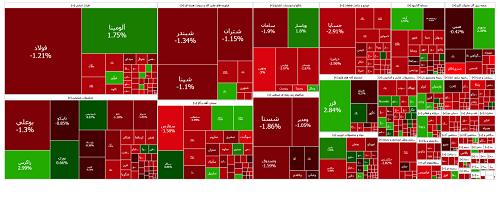 امروز فقط یک پنجم بازار (۸۸ نماد مثبت) سبزپوش و چهار پنجم (۵۳۵ نماد منفی) سرخپوش بود. نماد فارس تأثیر اندکی در رشد شاخص داشت اما نمادهای فولاد، شستا، بوعلی، خساپا، حکشتی و میدکو در افت شاخص تأثیر داشتند. در حالی که امروز هم خبری از بازگشایی نماد خودرو در بورس تهران نبود، اما نماد خساپا افت ۲.۹ درصدی در ارزش سهام خود داشت.