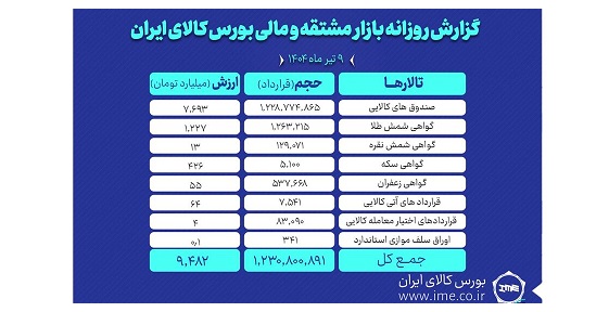 روز گذشته در بازار مشتقه و مالی بورس کالای ایران در مجموع بیش از یک میلیارد و ۲۳۰ میلیون و ۸۰۰ هزار قرارداد به ارزش ۹ هزار و ۴۸۲ میلیارد تومان منعقد شد.