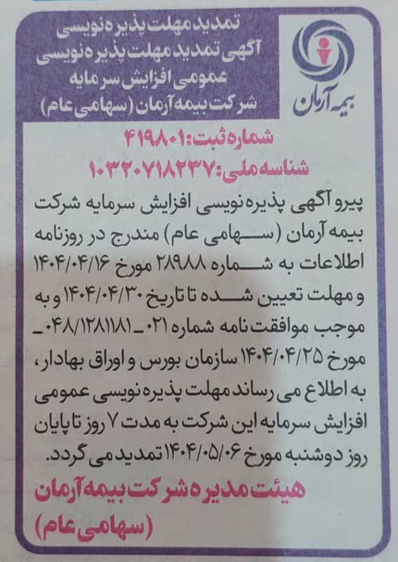به گزارش فراسو، متن کامل آگهی تمدید مهلت پذیره نویسی افزایش سرمایه شرکت بیمه آرمان که از سوی هیئت مدیره این شرکت انتشار یافته، بدین شرح است: