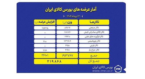 تالارهای بورس کالای ایران در روز شنبه ۲۱ تیرماه میزبان عرضه ۲۱۹ هزار و ۸۶۸ تن انواع محصول هستند که بیشترین حجم عرضه در تالار صنعتی است.