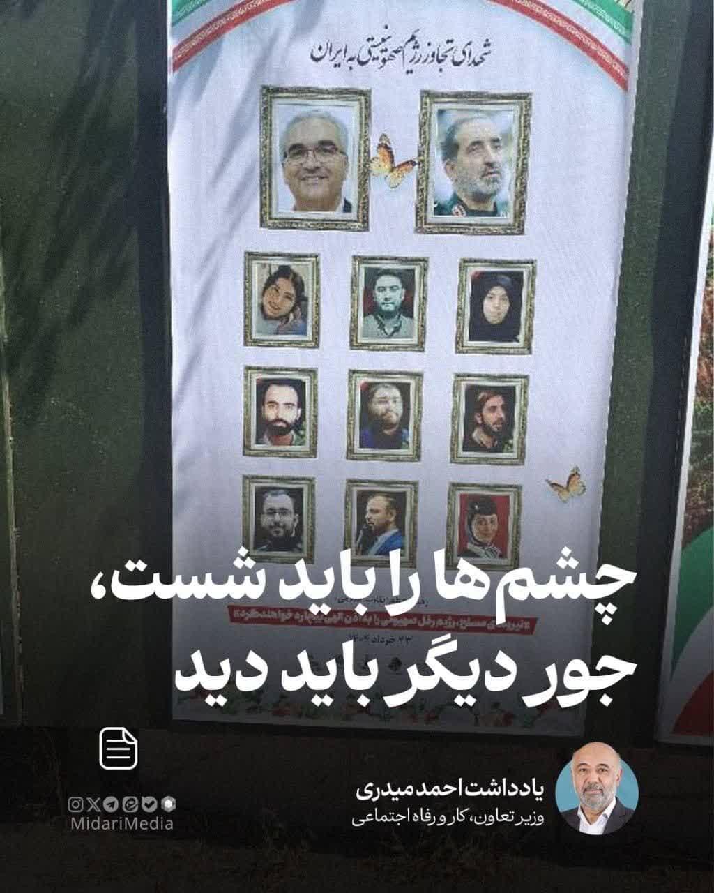 یادداشت آقای رسایی در نقد نمایش این تصویر بر نمایشگر وزارتخانه، به نکتهای پرداخته بود که اصلاً در مخیلۀ من نمیگنجید. بعد از نکتهسنجی ایشان، من به تابلوهایی که در شهر تهران از شهدای جنگ تحمیلی ۱۲ روزه توسط شهرداری تهران نصب شده، بیشتر دقت کردم. هنگامی که روز جمعه در مراسم تشییع پیکر مرحوم دکتر احمد توکلی شرکت کردم، در مسیر بازگشت پوستری دیدم که چند سازمان حکومتی آن را منتشر کرده بودند که در آنجا هم تصویر یک هموطن خانم بدون روسری بود.