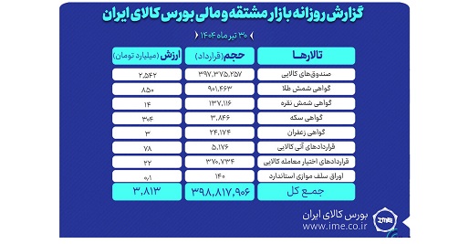 روز گذشته در بازار مشتقه و مالی بورس کالای ایران در مجموع بیش از ۳۹۸ میلیون و ۸۱۷ هزار قرارداد به ارزش ۳ هزار و ۸۱۳ میلیارد تومان منعقد شد.