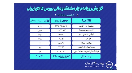 در روز اول شهریور ماه در بازار مشتقه و مالی بورس کالای ایران در مجموع ۶۴۰ میلیون و ۹۵۵ هزار و ۶۸۲ قرارداد به ارزش ۶ هزار و ۷۴۱ میلیارد تومان منعقد شد.