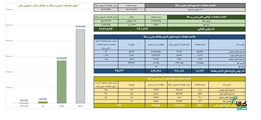 در قراردادهای اختیار معامله مبتنی بر طلا نیز ۱۰۱هزار و ۷۰۳ قرارداد به ارزش ۳۸ میلیارد تومان دادوستد شد. در قراردادهای اختیار معامله صندوق طلای لوتوس با یک درصد بیشترین نسبت حجم معاملات قراردادهای اختیار معامله به حجم معاملات دارایی پایه را داشت.