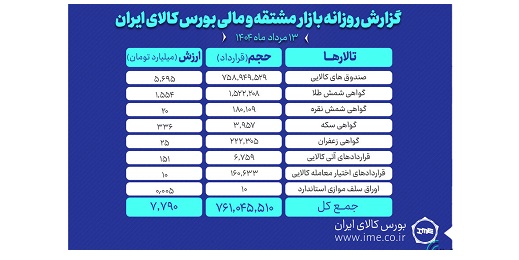 روز گذشته در بازار مشتقه و مالی بورس کالای ایران در مجموع بیش از ۷۶۱ میلیون و ۴۵ هزار و ۵۱۰ قرارداد به ارزش ۷ هزار و ۷۹۰ میلیارد تومان منعقد شد.
