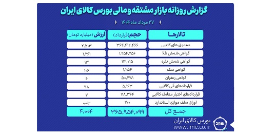 روز گذشته در بازار مشتقه و مالی بورس کالای ایران در مجموع بیش از ۳۶۵ میلیون و ۹۵۴ هزار و ۹۹ قرارداد به ارزش ۴ هزار و ۴ میلیارد تومان منعقد شد.