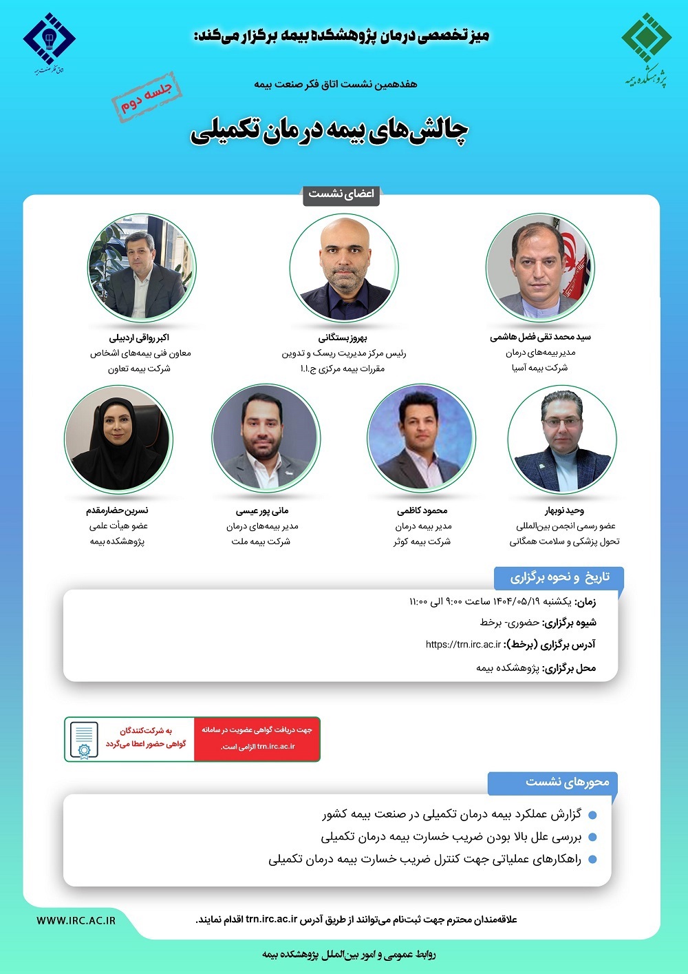 به گزارش فراسو به نقل از روابط عمومی و امور بینالملل پژوهشکده بیمه، در این نشست، آقایان «بهروز بستگانی، رئیس مرکز مدیریت ریسک و تدوین مقررات بیمه مرکزی ج.ا.ا»، «مانی پورعیسی، مدیر بیمه های درمان شرکت بیمه ملت»، «اکبر رواقی اردبیلی، معاون فنی بیمه¬های اشخاص شرکت بیمه تعاون»، «سید محمدتقی فضل هاشمی، مدیر بیمه های درمان شرکت بیمه آسیا»، «محمود کاظمی، مدیر بیمه درمان شرکت بیمه کوثر»، «وحید نوبهار، عضو رسمی انجمن بین المللی تحول پزشکی و سلامت همگانی» و خانم «نسرین حضار مقدم، عضو هیات علمی پژوهشکده بیمه» در خصوص محورهای «گزارش عملکرد بیمه درمان تکمیلی در صنعت بیمه کشور»، «بررسی علل بالا بودن ضریب خسارت بیمه درمان تکمیلی» و «راهکارهای عملیاتی برای کنترل ضریب خسارت رشته بیمه درمان تکمیلی» به بحت و بررسی خواهند پرداخت.