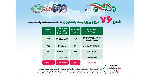 مدیرعامل پست بانک ایران از افتتاح ۷۶ طرح و پروژه پست بانک ایران با اعتباری بالغ بر ۷ هزار و ۷۴۴ میلیارد ریال در هفته دولت خبر داد و گفت: این پروژهها در ۱۷ استان کشور و با همکاری بخش خصوصی و دولتی و با ایجاد اشتغال برای ۳۳۱ نفر به بهرهبرداری میرسد.