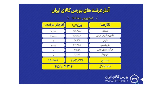 تالارهای بورس کالای ایران امروز چهارشنبه ۵ شهریور ماه میزبان عرضه ۴۵۱ هزار و ۲۳۴ تن انواع محصول است. بیشترین عرضه امروز در تالار صادراتی است.