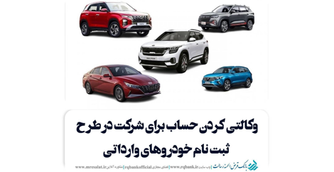 مشتریان بانک قرض الحسنه رسالت می توانند جهت ثبت نام در طرح جدید پیش فروش خودروهای وارداتی درخواست وکالتی نمودن حساب خود را از طریق سامانه پیشخوان مجازی رسالت به آدرس اینترنتی pishkhan.rqbank.ir به صورت غیرحضوری ثبت نمایند.