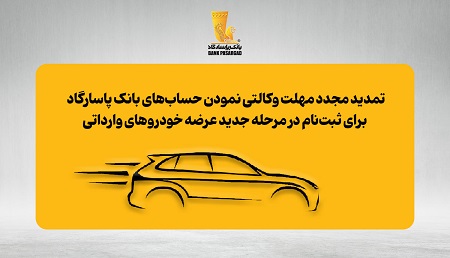مهلت وکالتی نمودن حسابهای بانک پاسارگاد برای ثبتنام در مرحله جدید عرضه خودروهای وارداتی مجدداً تا ساعت ۱۴ روز پنجشنبه ۱۶ مردادماه تمدید شد.