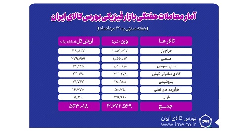 در معاملات هفته گذشته بازار فیزیکی بورس کالای ایران ۳ میلیون و ۶۷۲ هزار و ۵۶۹ تن انواع محصول به ارزش ۵۶.۳ هزار میلیارد تومان دادوستد شد.