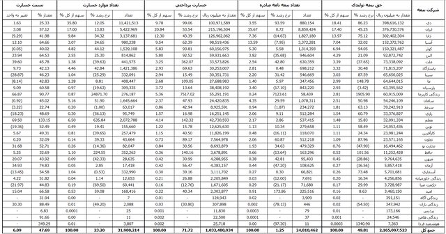 بیمه دی با حق بیمه ۳۹.۸ همتی و سهم ۱۸.۴ درصدی در جایگاه اول، بیمه ایران با حق بیمه ۳۷.۶ همتی و سهم ۱۷.۴ درصدی در جایگاه دوم و بیمه دانا با حق بیمه ۳۰ همتی و سهم ۱۳.۹ درصدی در جایگاه سوم شرکتها با بالاترین حق بیمه تولیدی قرار گرفتند.