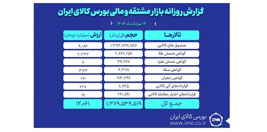 روز گذشته در بازار مشتقه و مالی بورس کالای ایران در مجموع بیش از یک میلیارد و ۳۷۹ میلیون و ۵۳۴ هزار و ۵۱۹ قرارداد به ارزش ۱۲ هزار و ۶۱ میلیارد تومان منعقد شد.