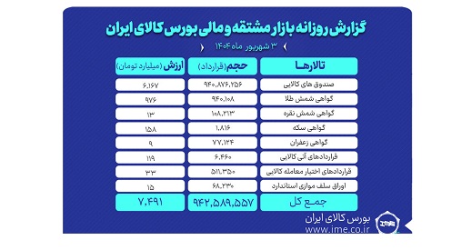 روز گذشته در بازار مشتقه و مالی بورس کالای ایران در مجموع ۹۴۲ میلیون و ۵۸۹ هزار و ۵۵۷ قرارداد به ارزش ۷ هزار و ۴۹۱ میلیارد تومان منعقد شد.