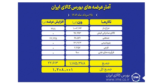 تالارهای بورس کالای ایران در روز شنبه۲۵ مرداد ماه میزبان عرضه یک میلیون و ۲۰۸ هزار و یک تن انواع محصول هستند که بیشترین حجم عرضه در تالار حراج باز به میزان یک میلیون و ۲ هزار و ۵۹۲ تن محصول است.