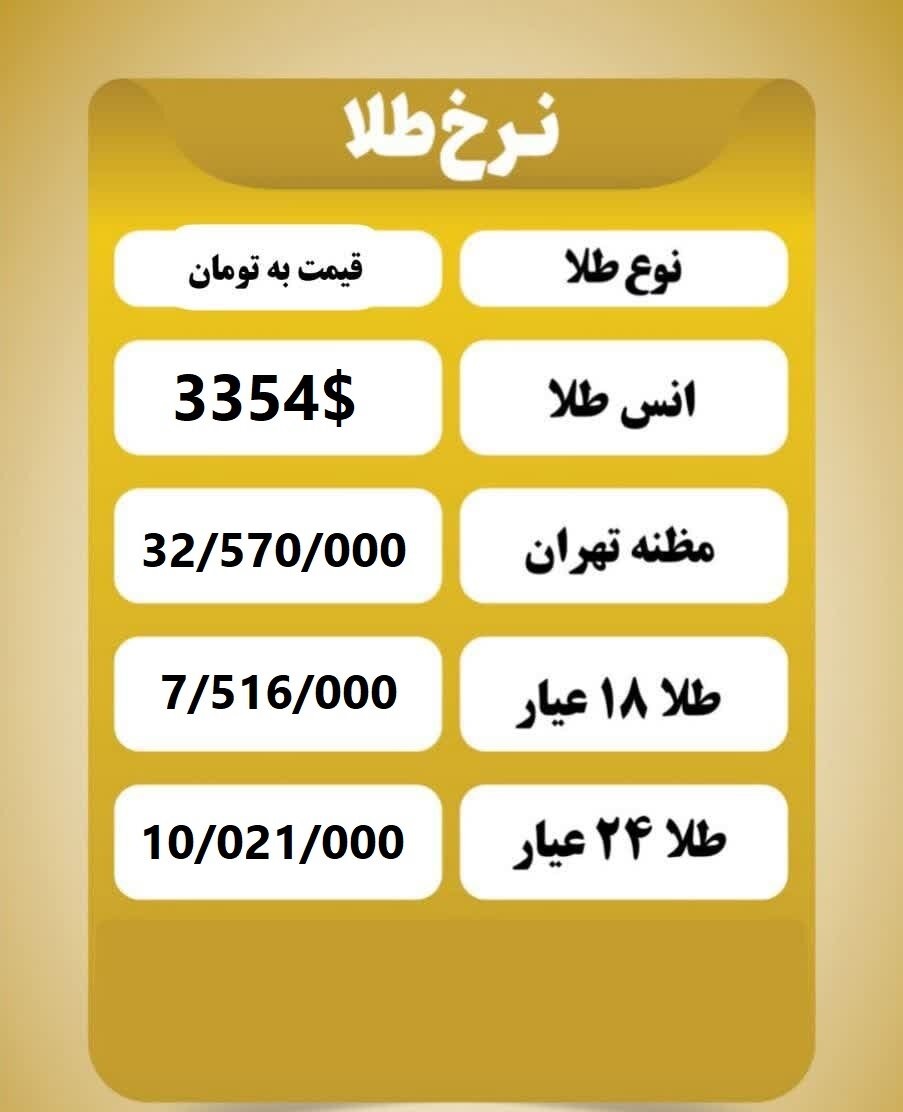 قیمت طلا امروز توسط اتحادیه صنف فروشندگان و سازندگان طلا، جواهر، نقره و سکه تهران اعلام شد. به گزارش فراسو، اتحادیه صنف فروشندگان و سازندگان طلا، جواهر، نقره و سکه تهران، قیمت طلا امرو ز- دوشنبه سیزدهم مرداد - را تا این ساعت به شرح زیر اعلام کرد: