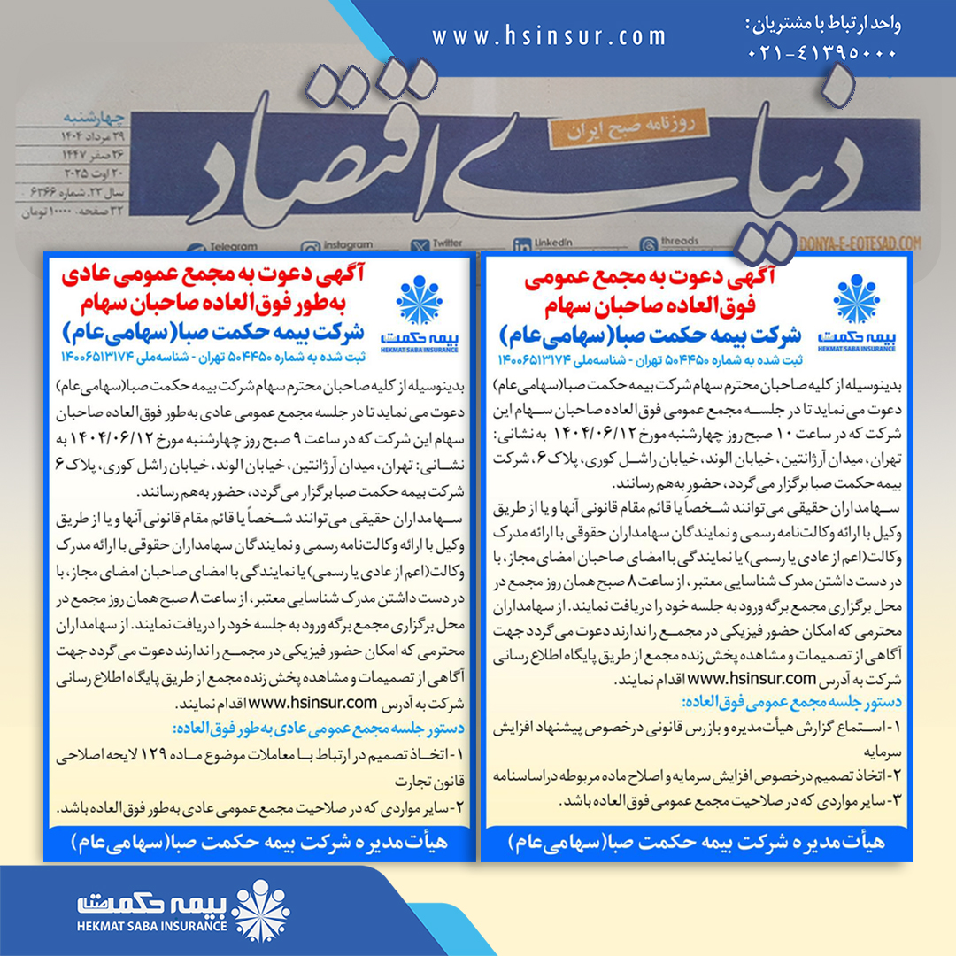 با هدف تصمیمگیری در مورد افزایش سرمایه و معاملات؛ مجامع عمومی عادی بطور فوق العاده و فو ق العاده شرکت بیمه حکمت صبا برگزار میشود.