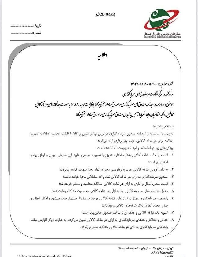 مدیر بازارهای مشتقه و ابزارهای نوین مالی بورس کالا با اشاره به اقدام ارزنده و مهم سازمان بورس و اوراق بهادار در تصویب و ابلاغ «اساسنامه و امیدنامه صندوق سرمایهگذاری در اوراق بهادار مبتنی بر کالا با قابلیت محاسبه NAV جداگانه برای هر شاخه کالایی»، این تصمیم را خدمتی ارزشمند به بازار سرمایه کشور دانست.