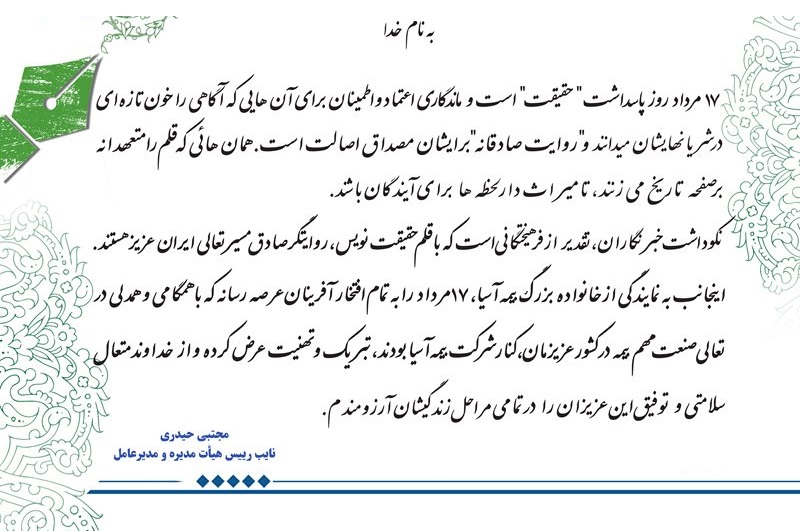 مجتبی حیدری مدیرعامل بیمه آسیا در پیامی ۱۷ مرداد روز خبرنگار را به اهالی رسانه تبریک گفت. به گزارش فراسو، متن این پیام بدین شرح است: