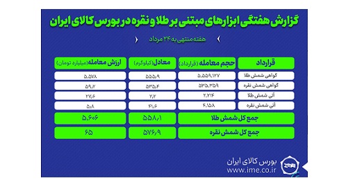 به این ترتیب در هفته گذشته در مجموع ۵۷۶.۹ کیلوگرم شمش نقره به ارزش حدود ۶۵ میلیارد تومان و ۵۵۸.۱ کیلوگرم شمش طلا به ارزش ۵،۶۰۶ میلیارد تومان در بورس کالا منعقد شد.