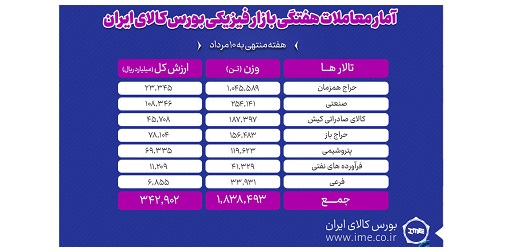 در معاملات هفته گذشته (هفته منتهی به ۱۰ مرداد) بازار فیزیکی بورس کالای ایران یک میلیون و ۸۳۸ هزار و ۴۹۳ تن انواع محصول به ارزش ۳۴.۳ هزار میلیارد تومان دادوستد شد.