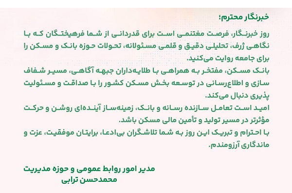 دکتر محمدحسن ترابی مدیرامور روابط عمومی و حوزه مدیریت بانک مسکن با صدور پیامی ضمن قدردانی از همراهی مسئولانه خبرنگاران در روایت تحولات حوزه بانک و مسکن، فرا رسیدن ۱۷ مردادماه روز خبرنگار را به اصحاب رسانه تبریک گفت.