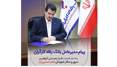 ما در بانک رفاه کارگران، ضمن تجدید پیمان با آرمانهای بلند حضرت امام حسین (ع) و شهدای کربلا، از درگاه خداوند متعال توفیق روزافزون برای خدمت به زائران حسینی و گام برداشتن در مسیر ارزشهای والای انسانی و اسلامی را مسئلت داریم.