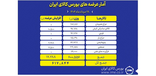 تالارهای بورس کالای ایران در روز سهشنبه ۲۸ مرداد ماه میزبان عرضه ۶۱۷ هزار و ۸۴۴ تن انواع محصول است.بیشترین حجم عرضه امروز متعلق به تالار حراج همزمان است به طوری که در این تالار ۲۰۶ هزار و ۱۸۶ تن سیمان عرضه می شود.