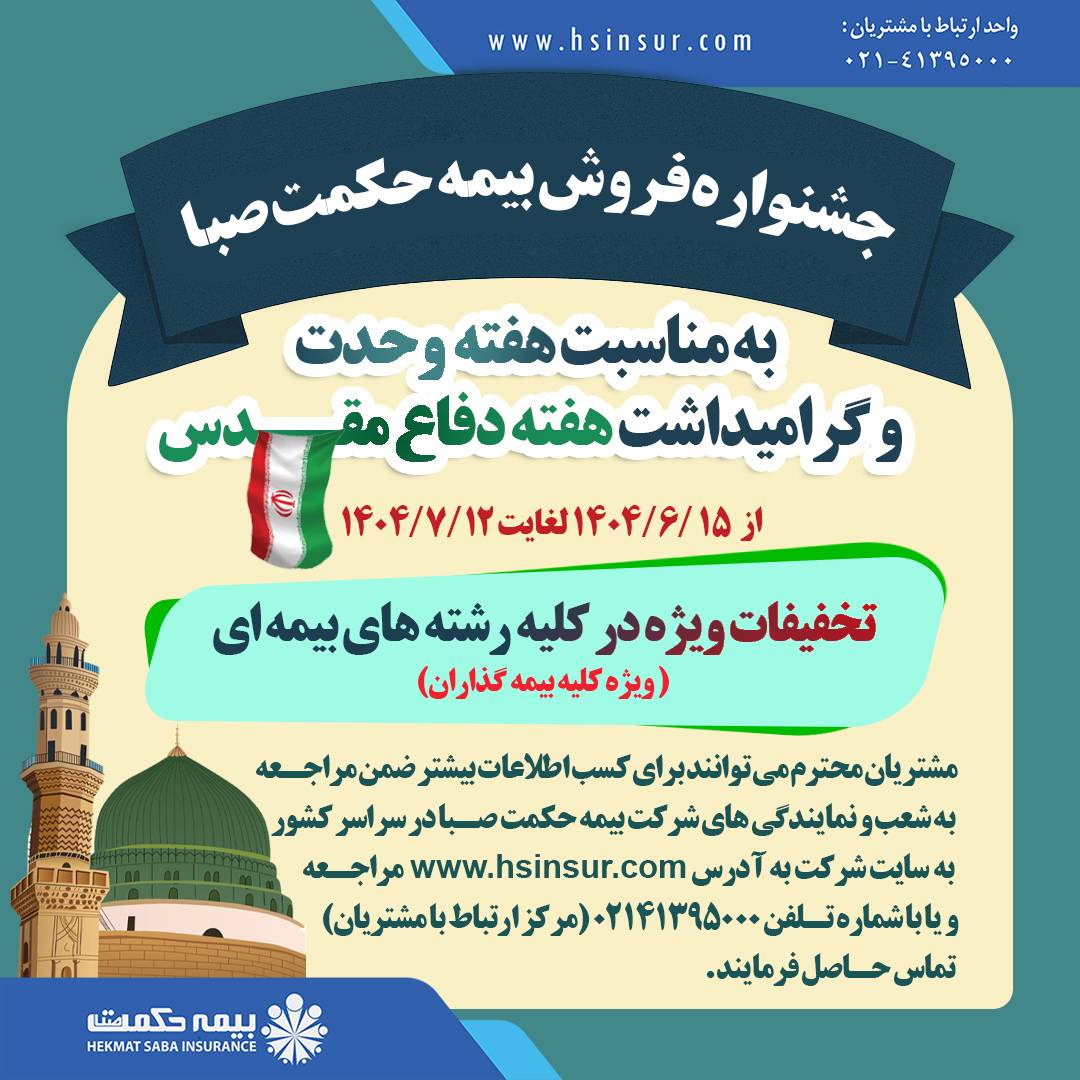 شرکت بیمه حکمت صبا به مناسبت گرامیداشت هفته دفاع مقدس و هفته وحدت ، جشنواره ویژه‌ای را با تخفیفات ویژه در تمامی رشته‌های بیمه‌ای برگزار می‌کند. این طرح فروش از تاریخ ۱۵ شهریور ۱۴۰۴ آغاز شده و تا ۱۲ مهر ۱۴۰۴ ادامه خواهد داشت.