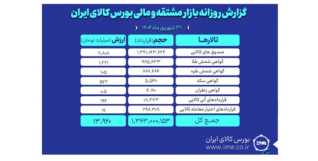 همچنین در معاملات روز ۳۰ شهریورماه بازار مشتقه و مالی، یک میلیارد و ۳۶۱ میلیون و ۴۳ هزار و ۶۲۴ واحد صندوق کالایی به ارزش ۱۱هزار و ۸۰۸ میلیارد تومان دست به دست شد. بیشترین ارزش معاملات نیز به صندوق طلای عیار مفید (عیار) اختصاص یافت.