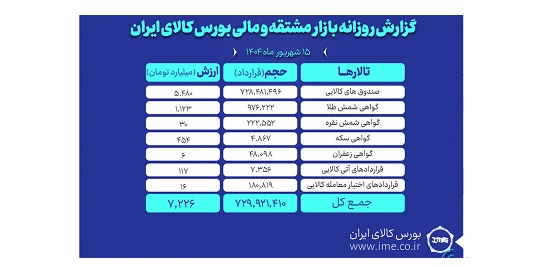 روز گذشته در بازار مشتقه و مالی بورس کالای ایران در مجموع بیش از ۷۲۹ میلیون و ۹۲۱ هزار قرارداد به ارزش ۷ هزار و ۲۲۶ میلیارد تومان منعقد شد.