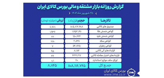 همچنین در معاملات روز ۲۵ شهریورماه بازار مشتقه و مالی، ۸۰۵ میلیون و ۸۱۲ هزار و ۶۸۸ واحد صندوق کالایی به ارزش ۶ هزار و ۴۷۱ میلیارد تومان دست به دست شد. بیشترین ارزش معاملات نیز به صندوق طلای عیار مفید (عیار) اختصاص یافت.
