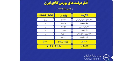 تالارهای بورس کالای ایران امروز چهارشنبه ۲ مهر ماه میزبان عرضه ۳۴۸ هزار و ۹۶۵ تن انواع محصول است.