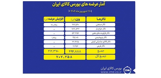 تالارهای بورس کالای ایران امروز دوشنبه ۱۷ شهریور ماه میزبان عرضه ۷۰۷ هزار و ۲۵۸ تن انواع محصول است. بیشترین عرضه امروز متعلق به تالار صنعتی است.