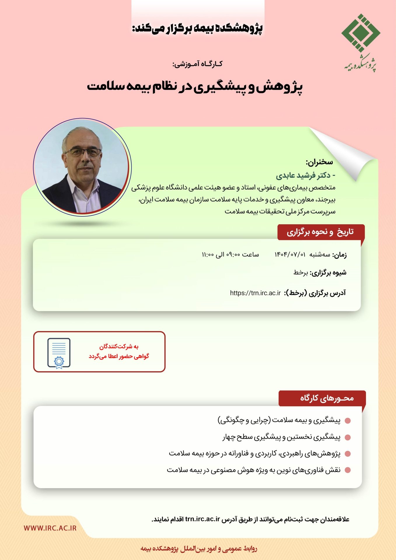کارگاه آموزشی با عنوان “پژوهش و پیشگیری در نظام بیمه سلامت” از ساعت 9:00 تا 11:00 روز سهشنبه 1 مهرماه 1404 به صورت برخط از طریق سامانه مدیریت یادگیری پژوهشکده بیمه برگزار میشود.